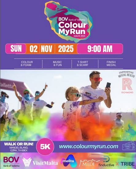 This year, Colour My Run proudly supports the Richmond Foundation, helping raise awareness and funds for mental health services in Malta. So not only are you having fun – you're making a difference!